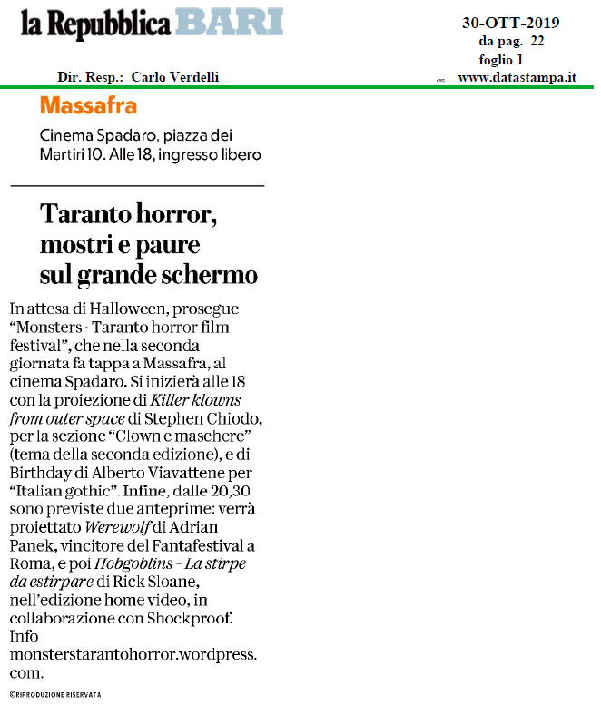 28/10/19 – Taranto Blog: Taranto: inizia domani il “Monsters Taranto Horror Film Festival”. Qui il programma completo.