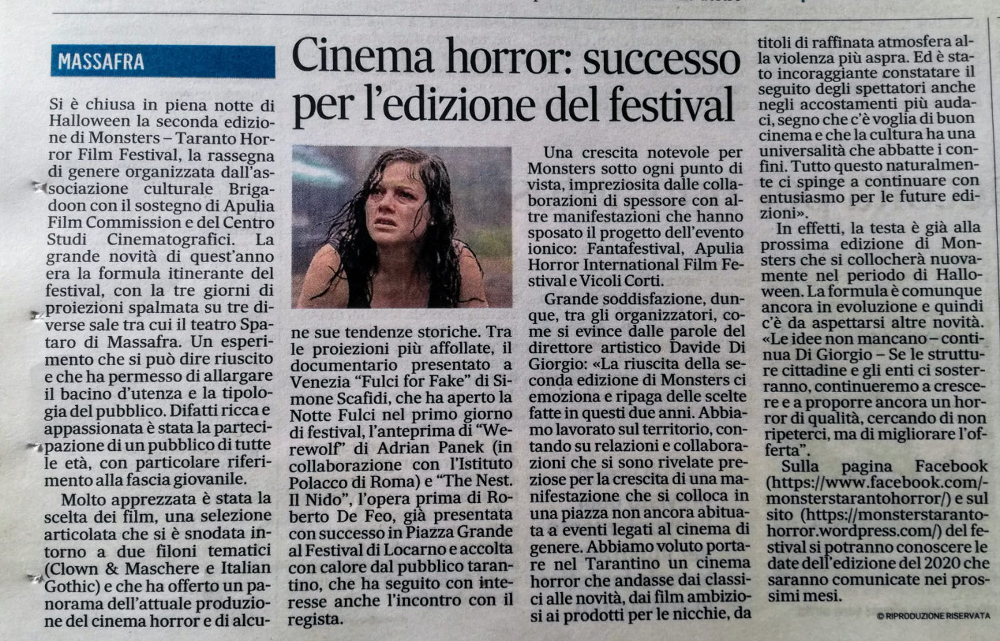 28/10/19 – Corriere di Taranto: Monsters Taranto Horror Film Festival